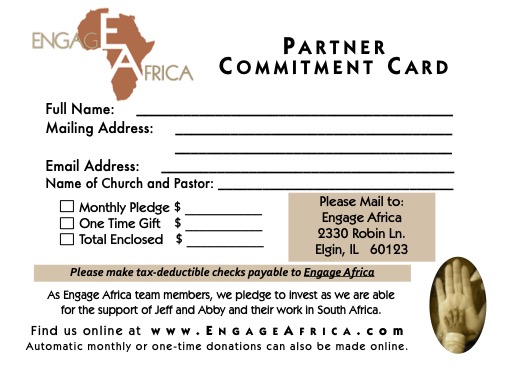 Download this Partner Commitment Card and mail it with your donation or monthly pledge to Engage Africa / The Hunt's.